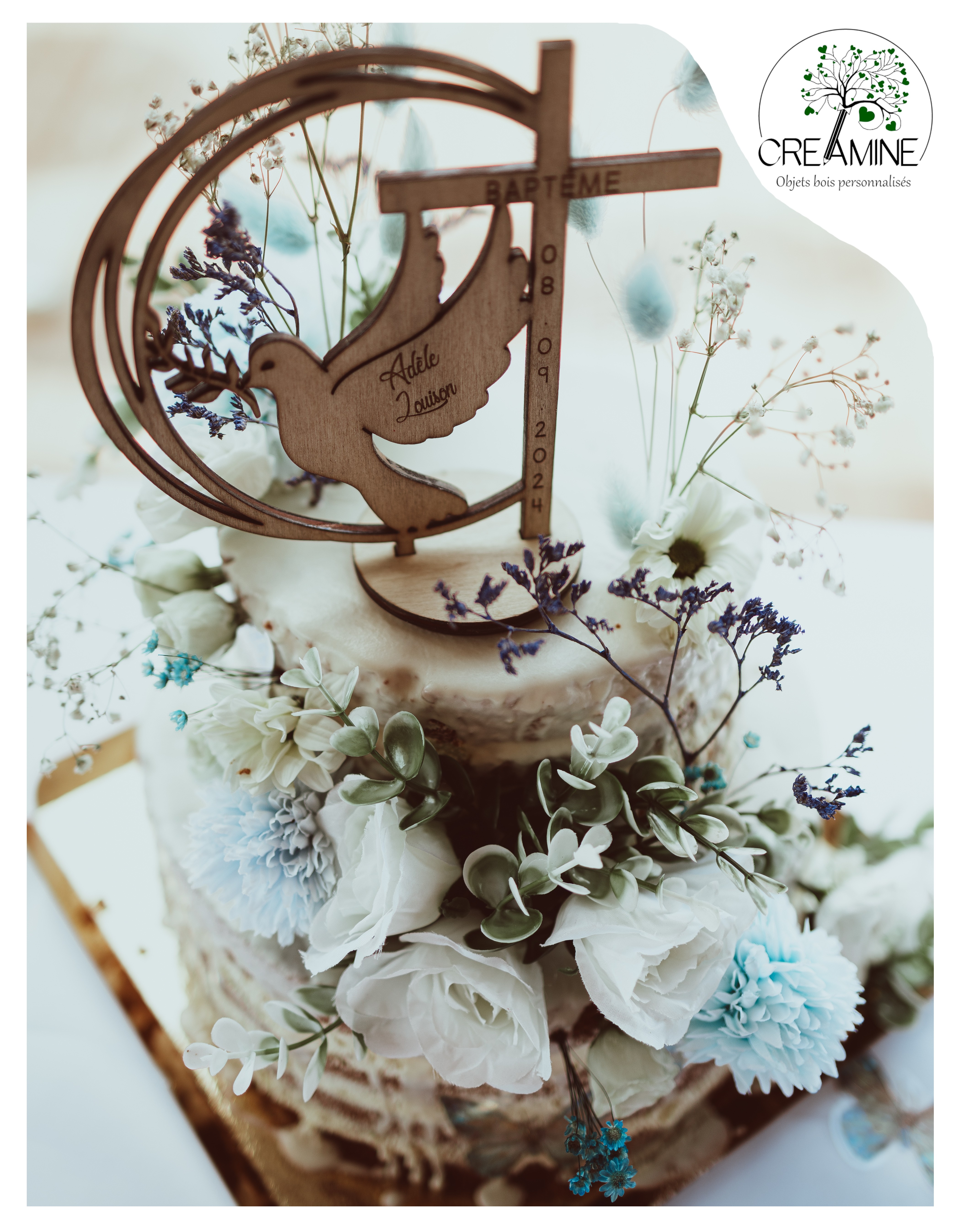 Un joli cake topper orné de symboles fort avec la croix, la colombe et la branche d'olivier qui viendront donner un sens spirituel fort à votre évènement.