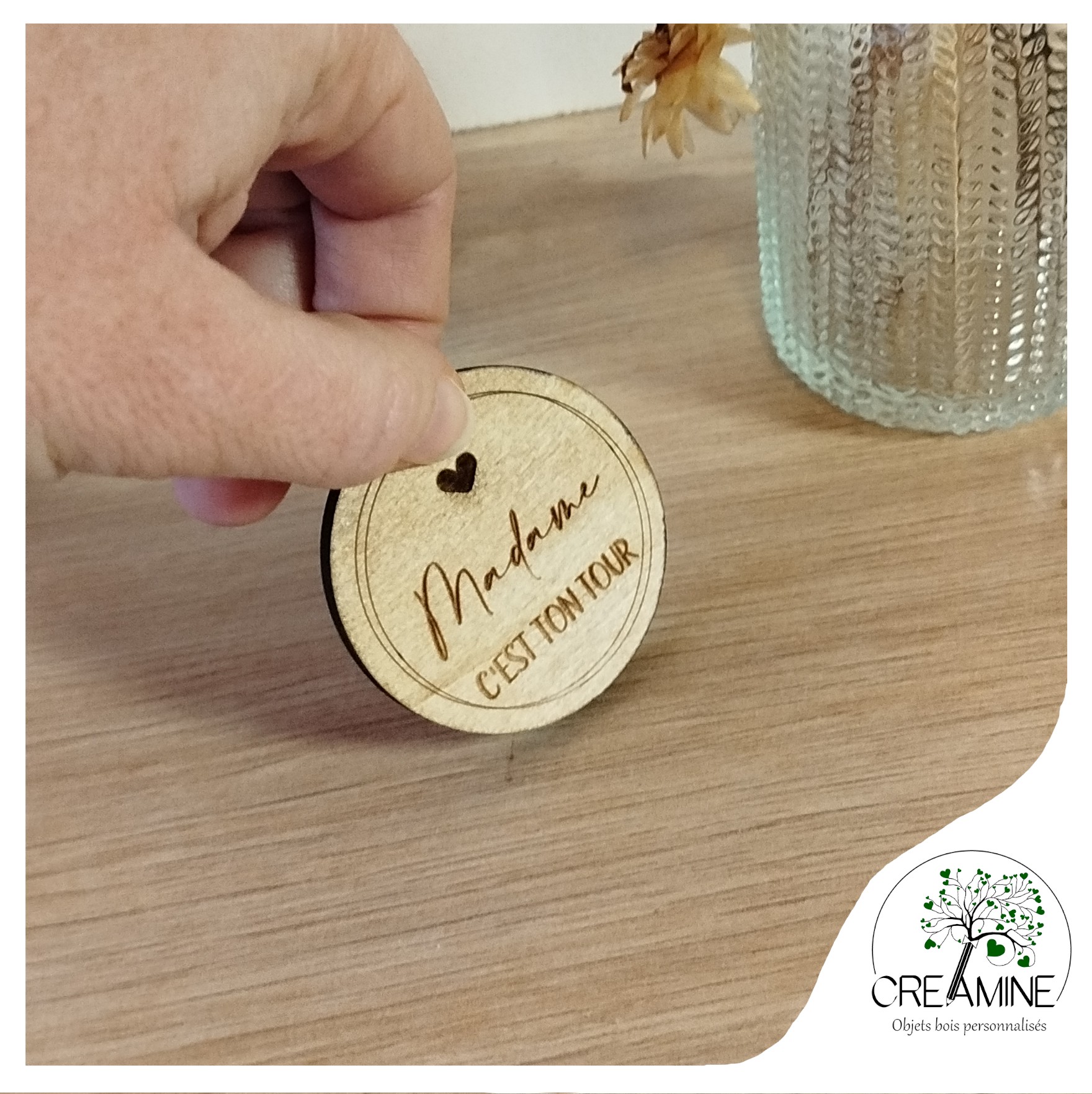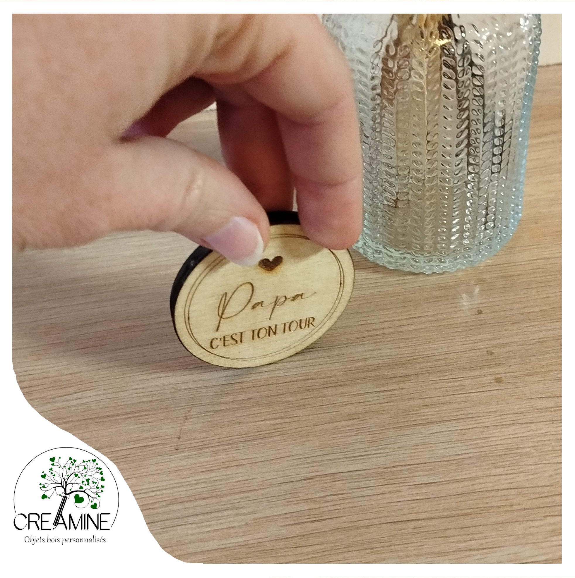 Le jeton “C’est ton tour” personnalisable est conçu pour aider les parents à éviter les disputes quotidiennes et à répartir équitablement les tâches parentales. Que ce soit pour changer une couche, donner le bain ou gérer une petite mission du quotidien, ce jeton en bois devient un outil ludique, pratique et original à avoir chez soi.