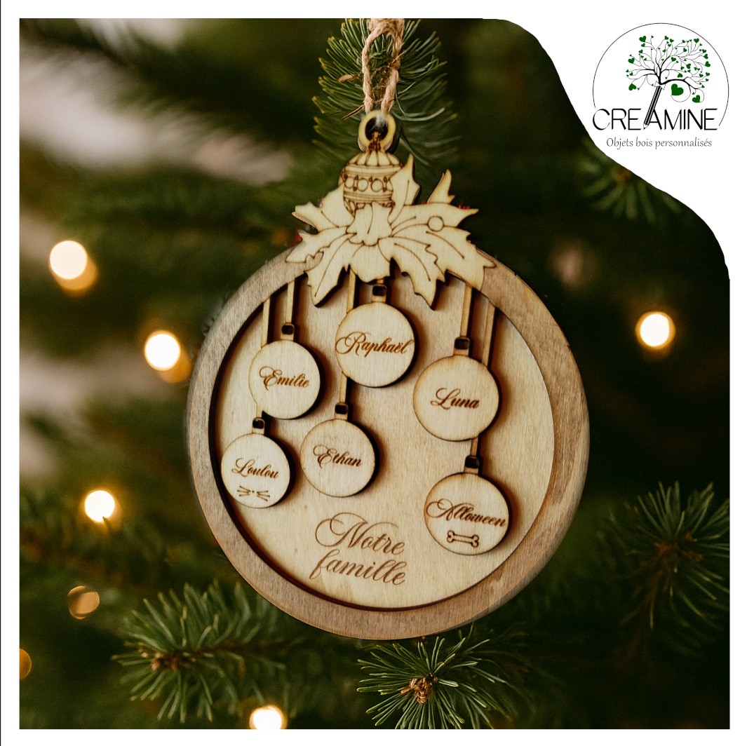 Vous pouvez personnaliser votre boule de noël en y gravant les membres de votre famille, y compris vos animaux. La boule de noël s'adapte en fonction du nombre de membre qui compose votre famille avec autant de boules suspendus que de personnes.