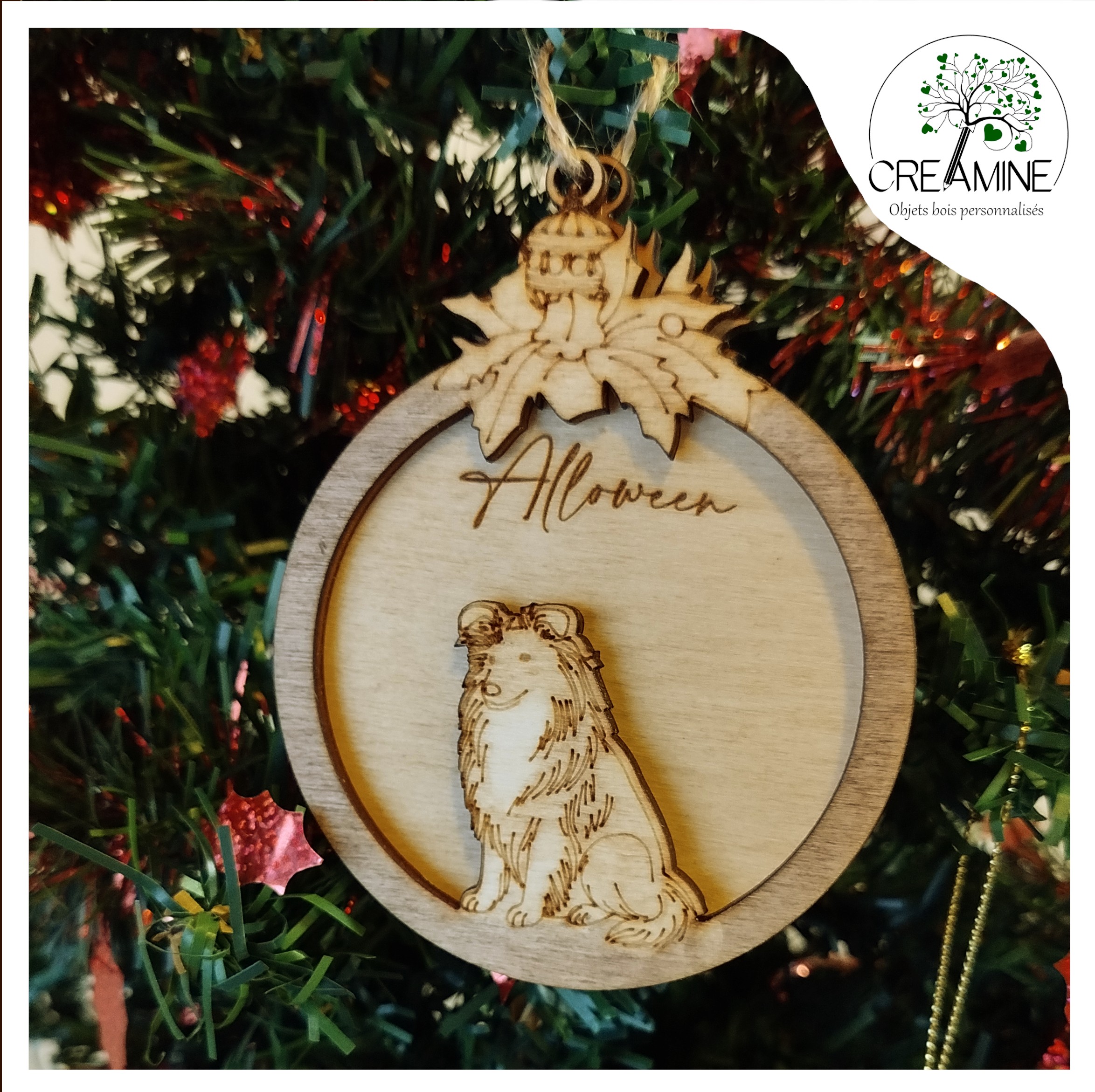 Boule de Noël personnalisée en bois – motif chien de race avec nom gravé