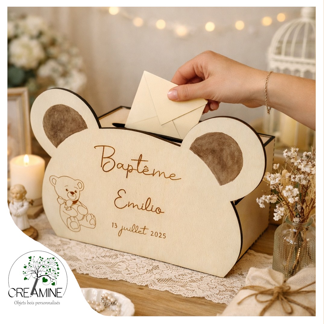 Grâce à sa fente discrète, vos invités peuvent facilement glisser cartes, mots doux et enveloppes à l’intérieur. Le prénom de l’enfant, l’événement et la date sont gravés avec précision, rendant chaque urne totalement unique.