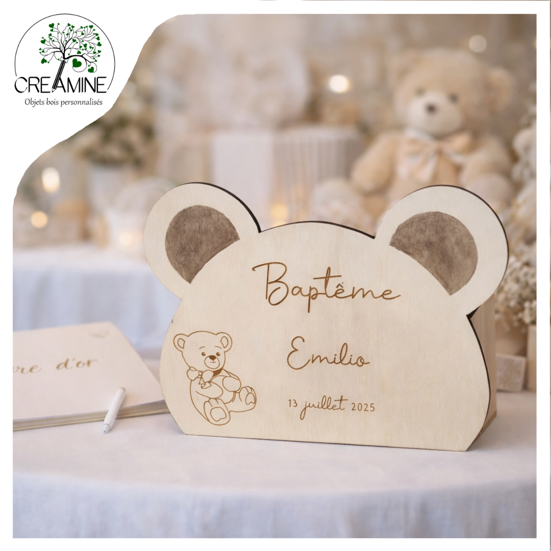 Conçue en bois, découpée et gravée avec soin, elle représente un adorable petit ours qui apporte douceur et élégance à votre table de souvenirs, de baptême ou de fête de naissance.