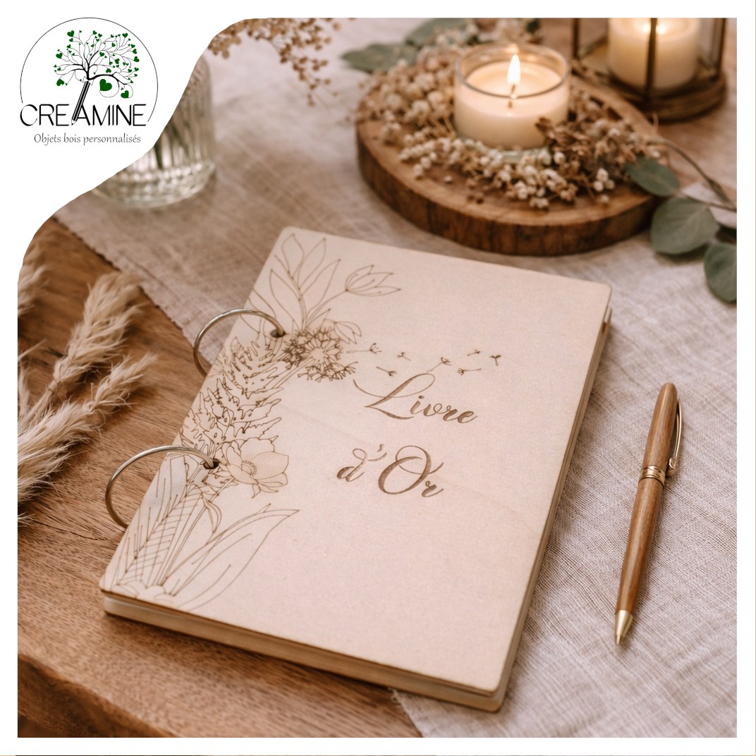 Vous pouvez soit opter pour un livre d’or gravé au titre « Livre d »Or » soit personnalisé le titre avec la gravure de votre choix.