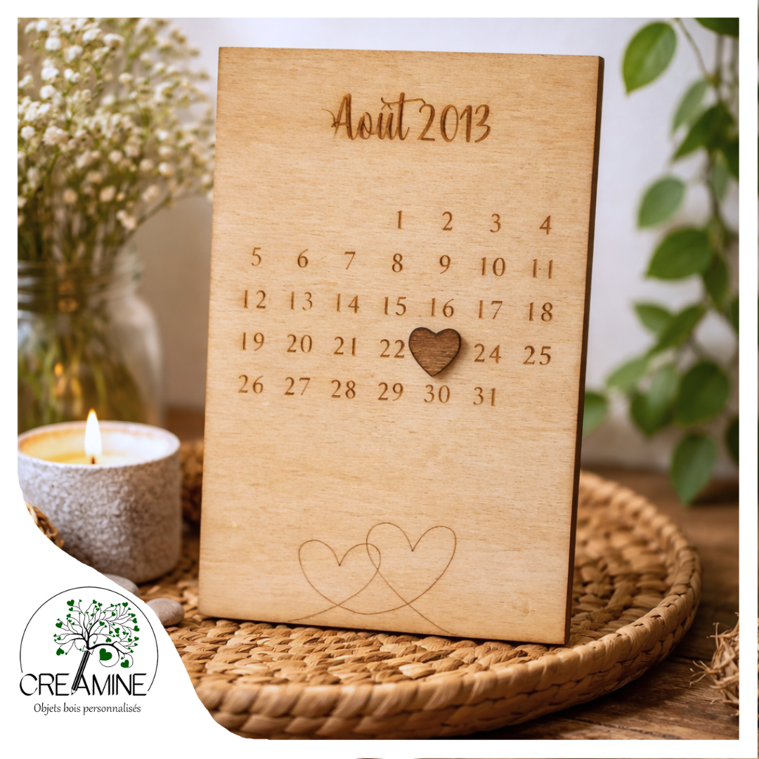 Cette création unique met en valeur une date précise, représentée visuellement sous forme de calendrier, afin de symboliser un événement marquant : rencontre, naissance, mariage, anniversaire ou toute autre étape importante.